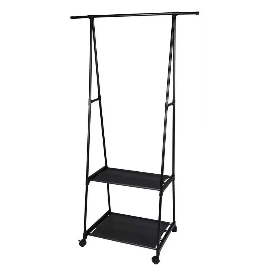 Regał stojący, garderoba z uchwytem na wieszaki i dwiema półkami. Regał wykonany z metalu, półki z włókniny poliestrowej. Tego rodzaju regał świetnie posłuży w łazience na szlafroki, ręczniki. W przedpokoju na kurtki, czapki, buty i inne akcesoria. Przyda się także w sypialni czy garderobie. Jest bardzo mocnej i stabilnej konstrukcji. Dzięki zamocowanym kółkom w każdej chwili z łatwością można go przesunąć w wybrane miejsce. Wieszak pasuje do wnętrz w stylu nowoczesnym, loft, industrialnym.