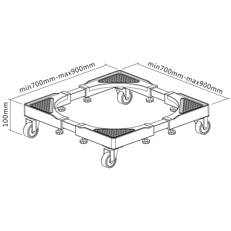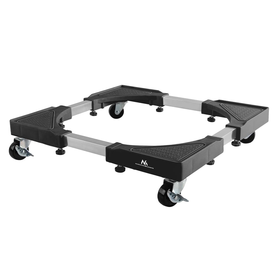 STABILNA PODSTAWA POD PRALKĘ I DUŻE URZĄDZENIA AGD Uniwersalna podstawa pod pralkę MC-119 to praktyczne rozwiązanie, które ułatwia codzienne korzystanie z dużych urządzeń elektrycznych, takich jak pralki, suszarki czy lodówki. Dzięki regulowanej szerokości w zakresie od 700 do 900 mm można ją z łatwością dopasować do różnych modeli sprzętów. Konstrukcja została zaprojektowana z myślą o maksymalnym udźwigu do 200 kg, co zapewnia bezpieczeństwo nawet przy cięższych urządzeniach.