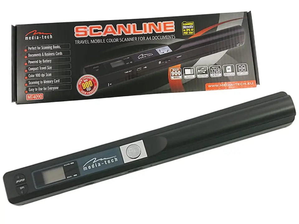 Mobilny, liniowy, ręczny, kolorowy skaner dokumentów A4 i mniejszych, rozdzielczość 900 dpi, zapis skanów na karcie T-Flash, zasilanie z 2 baterii AA