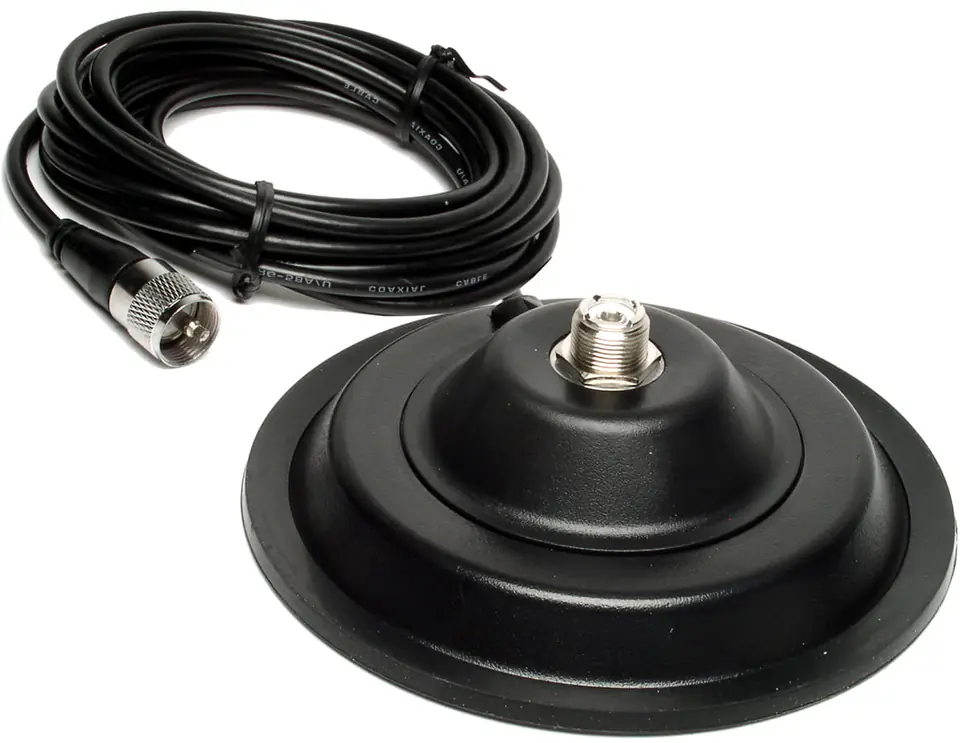 Mocny magnes 14,5 cm, do szczególnych zadań. Utrzyma antenę o długości nawet do 160cm, co przy przemieszczaniu się pojazdu, jest poza możliwościami mniejszych magnesów. W zestawie guma zapobiegająca zarysowaniom karoserii. Kabel o długości około 4 metrów wlutowany fabrycznie w podstawę i zakończony typowym dla CM wtykiem PL. Antena wkręcamy również w złącze PL. Podstawa niezwykle uniwersalna i solidna.