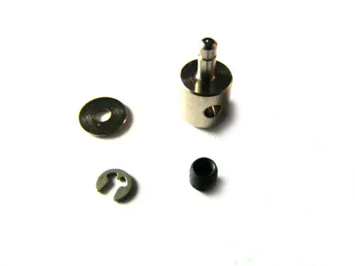 Mocowanie bowdena na serwo M2 z zawleczką zaciskową, podkładką i śrubką imbusową.