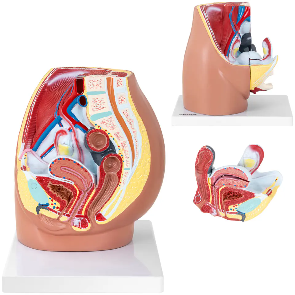 Trójwymiarowy model miednicy został wykonany z wysoką precyzją i w pełni oddaje rzeczywistą budowę narządów w rzeczywistej skali. Zawiera wyjmowane elementy, takie jak połowa układu rozrodczego w tym otwartą macicę. Uwzględnia ludzkie kości i stawy czym doskonale imituje prawdziwą miednice żeńską. Model wykonano z trwałego tworzywa PVC o długiej żywotności i wsparto na stabilnej podstawie.