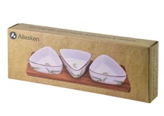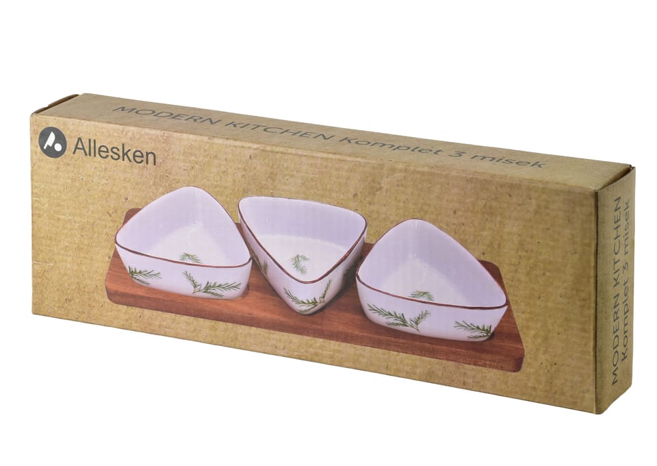 Ten stylowy zestaw marki Allesken z kolekcji MODERN KICTHEN to nowoczesna interpretacja klasycznych naczyń do serwowania, która przyciąga wzrok swoim geometrycznym designem i naturalnym wykończeniem. Głównym elementem kompletu jest podłużna, prostokątna deska wykonana z trwałego drewna akacjowego o wymiarach 28 na 9,5 centymetra, która dzięki swojej grubości i wyraźnemu usłojeniu stanowi solidną i elegancką podstawę. Na niej stabilnie spoczywają trzy miseczki o unikalnym, trójkątnym kształcie i boku długości 9,5 centymetra, co nadaje całości dynamicznego i bardzo współczesnego charakteru, idealnie wpisującego się w estetykę modern kitchen.Biała porcelana, z której wykonano naczynia, została ozdobiona subtelną kalką z motywem rozmarynu, wprowadzającą do jadalni powiew świeżości i roślinny akcent. Zestaw ten został zaprojektowany z myślą o serwowaniu różnorodnych dipów, sosów oraz drobnych przekąsek, takich jak orzeszki czy oliwki, pozwalając na ich estetyczne wyeksponowanie podczas spotkań towarzyskich. Producent zadbał również o aspekt praktyczny, oferując możliwość wygodnego mycia porcelanowych miseczek w zmywarce, podczas gdy naturalną deskę akacjową zaleca się czyścić ręcznie, aby jak najdłużej zachować jej pierwotny blask i odporność na uszkodzenia. poj. miski: 100mlwymiar miski: 9,5x4cm `