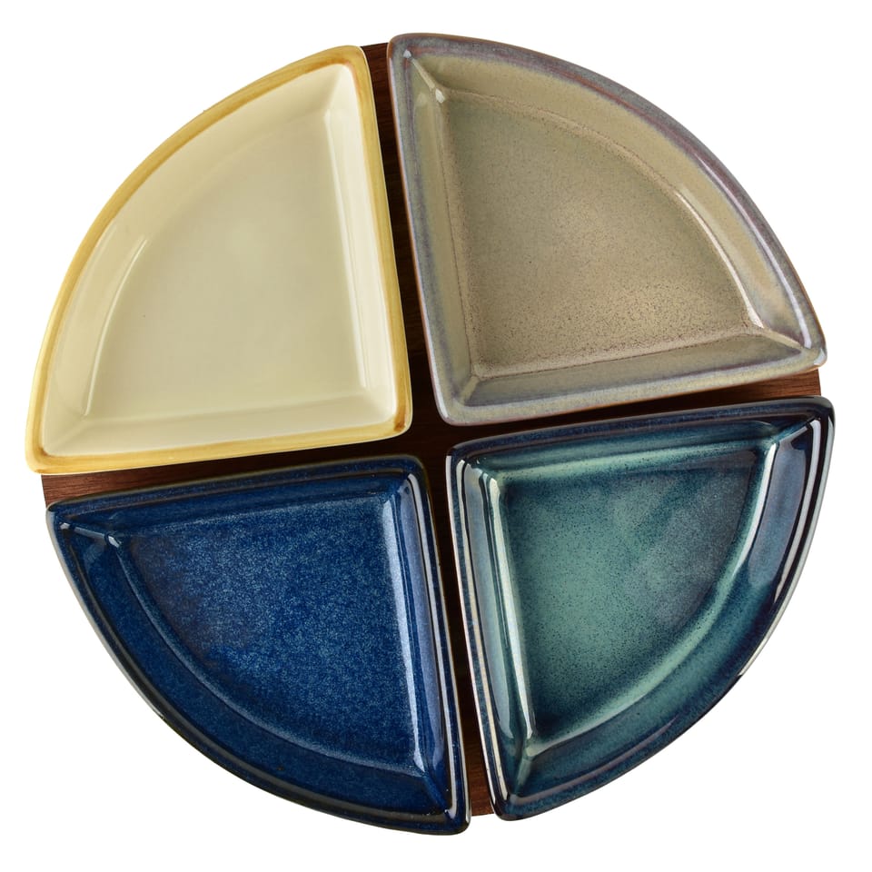 Ten designerski zestaw marki Allesken z kolekcji MODERN KITCHEN to niezwykle pomysłowa propozycja, która wprowadza do nowoczesnej jadalni nutę kreatywności i radosnego kolorytu. Głównym elementem kompletu jest okrągła deska z drewna akacjowego o średnicy 21,5 centymetra, która dzięki swojej naturalnej strukturze i ciepłej barwie stanowi solidną bazę dla pozostałych elementów. Na jej powierzchni ułożone są cztery porcelanowe miseczki o trójkątnym kształcie i wymiarach 13,5 na 9,5 centymetra, które po zestawieniu ze sobą tworzą na desce spójną, geometryczną formę przypominającą kulinarną mozaikę.Zestaw wyróżnia się atrakcyjnym mixem kolorystycznym, co sprawia, że serwowane w nim przekąski, dipy czy drobne przekąski tapas prezentują się wyjątkowo apetycznie i nowocześnie. Dzięki przemyślanej formie naczynia idealnie wypełniają przestrzeń deski, pozwalając na efektowne zaserwowanie aż czterech różnych dodatków jednocześnie. Producent połączył tutaj estetykę z wysoką funkcjonalnością, ponieważ porcelanowe miseczki można bez przeszkód myć w zmywarce, co znacząco ułatwia porządki po wizycie gości. Drewnianą podstawę należy natomiast pielęgnować poprzez mycie ręczne, co gwarantuje zachowanie jej trwałości oraz pięknego wyglądu przez długie lata.wymiary miski: 4x13,5x9,5x3cmpojemność: 4x95ml