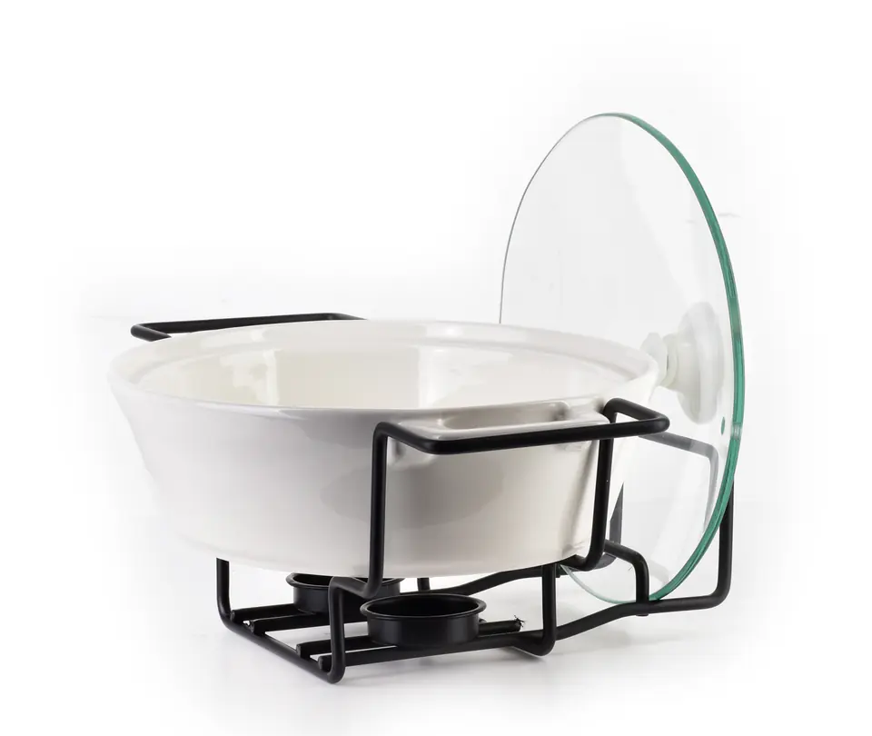 Naczynie z podgrzewaczem marki Allesken z serii MODERN KITCHEN poj. 1,1L, 27,6x18,7xh6,2cm to serwowanie potraw na co dzień i od święta. . Kolor: granatowy, czarny stelaż . Materiał: kamionka . . Marka: Allesken . Zastosowanie: serwowanie potraw . Pojemność produktu: 1,1L . Wymiar: 27,6x18,7xh6,2cm Symbol: HTN5809,5905771405809 . Kolekcja: MODERN KITCHEN Naczynie jest idealne do serwowania najróżniejszych potraw. Stabilny stojak wykonany ze stali chromowanej umożliwia serwowanie gorącej potrawy. Dzięki podgrzewaczom serwowane dania pozostaną ciepłe przez długi czas Szklana pokrywa posiada ceramiczny uchwyt Naczynie oraz pokrywę można myć w zmywarce Stojak czyścić wilgotną ściereczką Stojak posiada miejsce na umieszczenie świeczek typu tea-light (do zestawu NIE są dołączone świeczki)