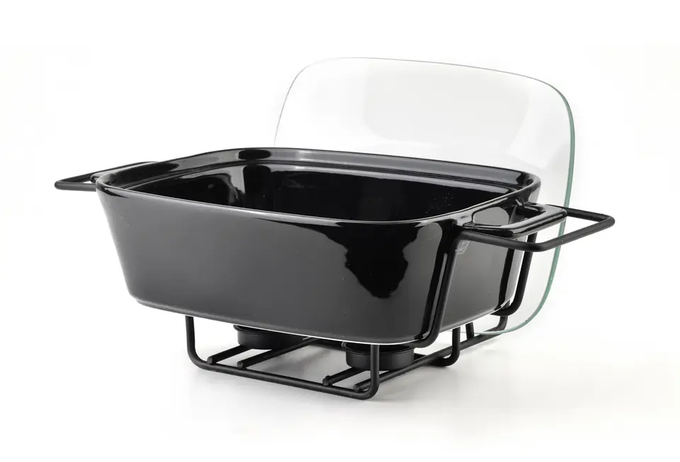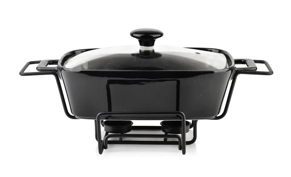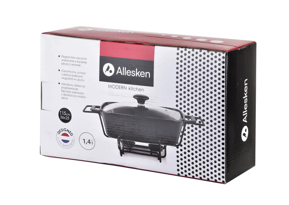 Naczynie z podgrzewaczem marki Allesken z serii MODERN KITCHEN poj.1,4L, 36x25x15cmto serwowanie potraw na co dzień i od święta. . Kolor: czarny, czarny stelaż . Materiał: kamionka . Marka: Allesken . Zastosowanie: serwowanie potraw . Pojemność produktu: 1,4L . Wymiar: 36x25x15cm . Symbol: HTN3140, 5905771403140 . Kolekcja: MODERN KITCHEN Naczynie jest idealne do serwowania najróżniejszych potraw. Stabilny stojak wykonany ze stali chromowanej umożliwia serwowanie gorącej potrawy. Dzięki podgrzewaczom serwowane dania pozostaną ciepłe przez długi czas. Szklana pokrywa posiada ceramiczny uchwyt. Naczynie oraz pokrywę można myć w zmywarce. Stojak czyścić wilgotną ściereczką. Stojak posiada miejsce na umieszczenie świeczek typu tea-light (do zestawu NIE sądołączone świeczki) INFORMACJE DODATKOWE: NIE POZOSTAWIAĆ PUSTEGO NACZYNIA NAD ŹRÓDŁEM CIEPŁA . Odporność na temperaturę do 140 stopni C . Nie umieszczać w mikrofali . Nie umieszczać w piekarniku . Naczynie służy do serwowania potraw O MARCE Allesken, znana marka charakteryzuje się niepowtarzalnymi zdobieniami oraz najwyższej jakości materiałami, dzięki czemu posłuży na długie lata. waga: waga z opakowaniem: zapakowany jednostkowo w kolorowy box: