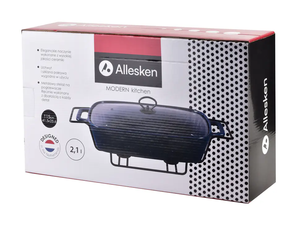 Naczynie z podgrzewaczem marki Allesken z serii MODERN KITCHEN poj. 2,1L, 41,5x25,6zh15cm to serwowanie potraw na co dzień i od święta. . Kolor: granatowy, czarny stelaż . Materiał: kamionka . Marka: Allesken . Zastosowanie: serwowanie potraw . Pojemność produktu: 2,1L . Wymiar: 41,5x25,6xh15cm . Symbol: HTN5540,5905771405540 . Kolekcja: MODERN KITCHEN Naczynie jest idealne do serwowania najróżniejszych potraw. Stabilny stojak wykonany ze stali chromowanej umożliwia serwowanie gorącej potrawy. Dzięki podgrzewaczom serwowane dania pozostaną ciepłe przez długi czas Szklana pokrywa posiada ceramiczny uchwyt Naczynie oraz pokrywę można myć w zmywarce Stojak czyścić wilgotną ściereczką Stojak posiada miejsce na umieszczenie świeczek typu tea-light (do zestawu NIE są dołączone świeczki)