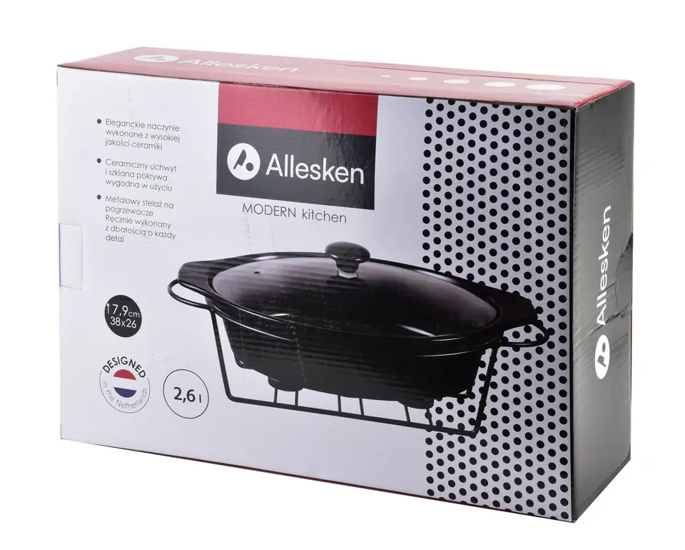 Naczynie z podgrzewaczem marki Allesken z serii MODERN KITCHEN poj. 2,6L, 38x26x7,9cm toserwowanie potraw na co dzień i od święta. . Kolor: granatowy, czarny stelaż . Materiał: kamionka . Marka: Allesken . Zastosowanie: serwowanie potraw . Pojemność produktu: 2,6L . Wymiar: 38x26xh7,9cm . Symbol: HTN0018,5905771410018 . Kolekcja: MODERN KITCHEN Naczynie jest idealne do serwowania najróżniejszych potraw. Stabilny stojak wykonany ze stali chromowanej umożliwia serwowanie gorącej potrawy. Dzięki podgrzewaczom serwowane dania pozostaną ciepłe przez długi czas Szklana pokrywa posiada ceramiczny uchwyt Naczynie oraz pokrywę można myć w zmywarce Stojak czyścić wilgotną ściereczką Stojak posiada miejsce na umieszczenie świeczek typu tea-light (do zestawu NIE sądołączone świeczki)