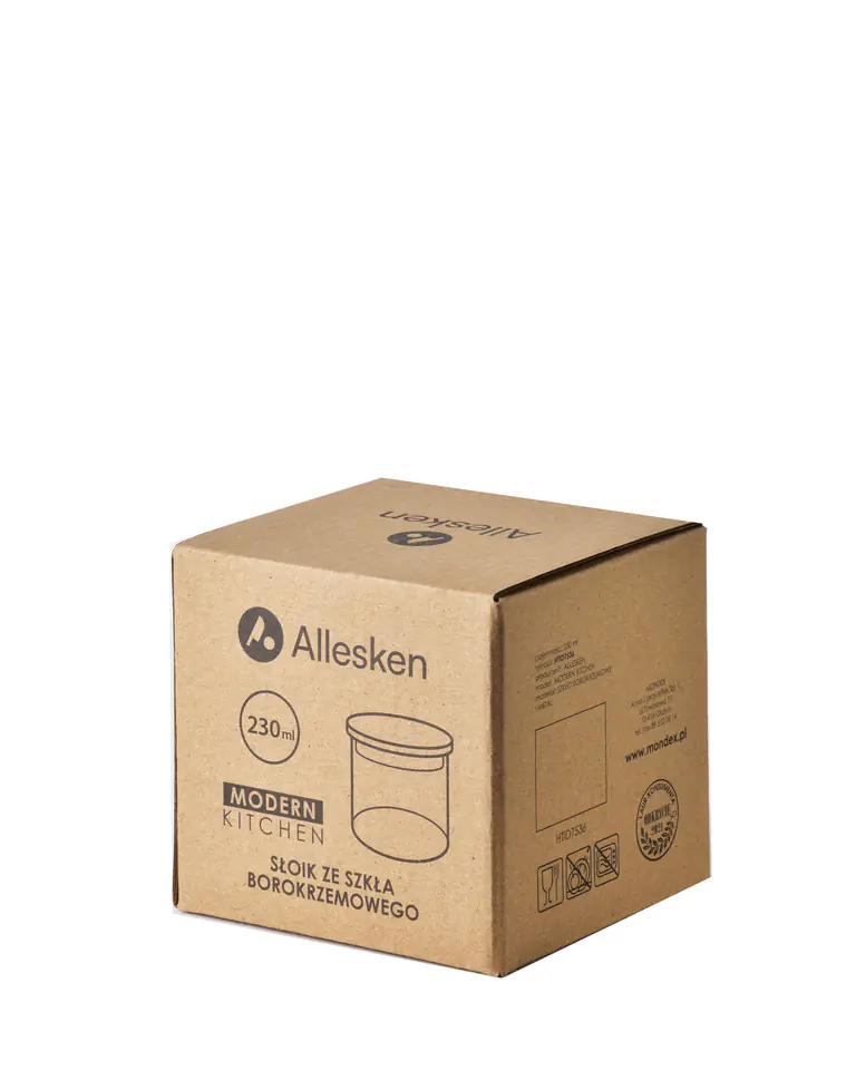 Słój z kolekcji MODERN KITCHEN marki Allesken o pojemności 230 ml - niezbędny towarzysz wszystkich kulinarnych przygód! Wykonany z precyzją i zaprojektowany, aby bez wysiłku zachować świeżość, smak i żywość ulubionych składników, ten wyjątkowy szklany słoik zrewolucjonizuje sposób przechowywania, eksponowania i rozkoszowania się kuchennymi podbojami.pojemność: 230mlwymiar: 9x8,4xh7,4cmwaga: 128g