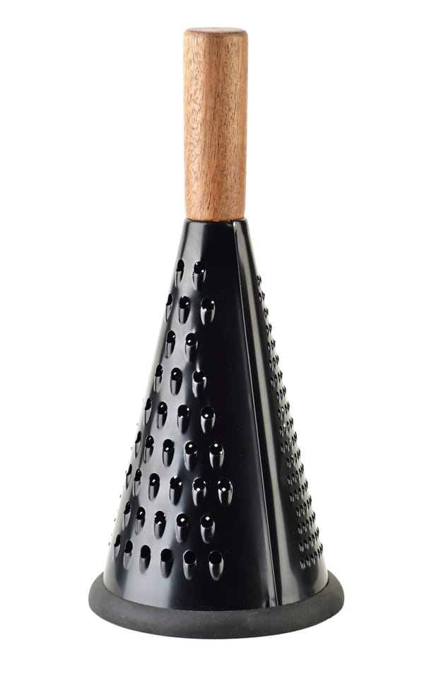 Tarka z serii MODERN KICTHEN wykonana ze stalo nierdzewnej z drewnianą rączką.Stożkowa forma gwarantuje łatwośc ścierania warzyw, sera i inncyh przysmaków.wymiary: 12x12xh27,5cmwaga: 160gzapakowana w obejmę i folię