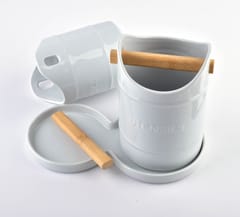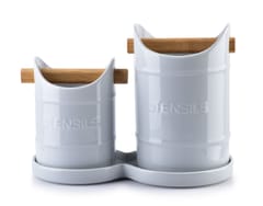 Zestaw na przybory kuchenne z serii MODERN LIFE marki COOKINI by MONDEX. Wykonana z porcelany oraz drewna. Dzięki prostej formie dopasuje się do każdego wnętrza. Idealnie sprawdzi się w połączeniu z pozostałymi produktami z serii MODERN LIFE Wymiary: podstawka: 24.5x13xh2cm średnica: L:11.5cm M:9.5cm wysokość: L:18cm M:13.5cm