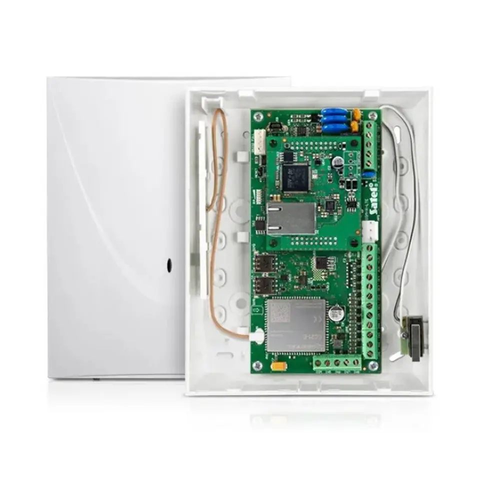 Możliwości urządzenia można rozszerzyć o połączenie sieciowe Ethernet za pomocą dedykowanego modułu GSM-X-ETH (dostępny osobno)