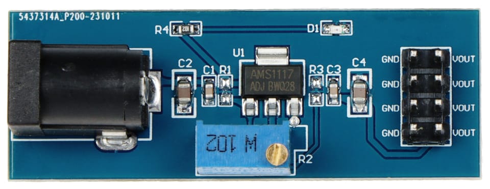 Moduł przetwornicy obniżającej napięcieUrządzenie PZD-AMS1117-ADJ konwertuje napięcie wejściowe do wartości 1.5V ... 35V DC