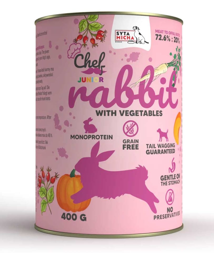 Królik z warzywami JUNIOR to zdrowa, smaczna i pełnoporcjowa karma mokra dla szczeniąt, której skład został opracowany przez naszego specjalistę żywienia psów. Wybierając właśnie tę karmę możesz mieć pewność, że rosnącemu organizmowi Twojego pupila zostaną dostarczone wszystkie niezbędne składniki odżywcze, witaminy i minerały.