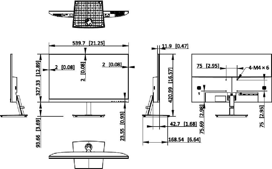 Wymiary produktu (szer. × wys. × gł.)Z podstawą: 539.7 (szer.) mm × 427,82 (wys.) mm × 185,74 (gł.) mm; 21.25 (szer.) × 16,84 (wys.) × 7,31 (gł.) cala. Bez podstawy: 539.7 (szer.) mm × 327,33 (wys.) mm × 42,7 (gł.) mm; 21.25 (szer.) × 12,89 (wys.) × 1,68 (gł.) cala