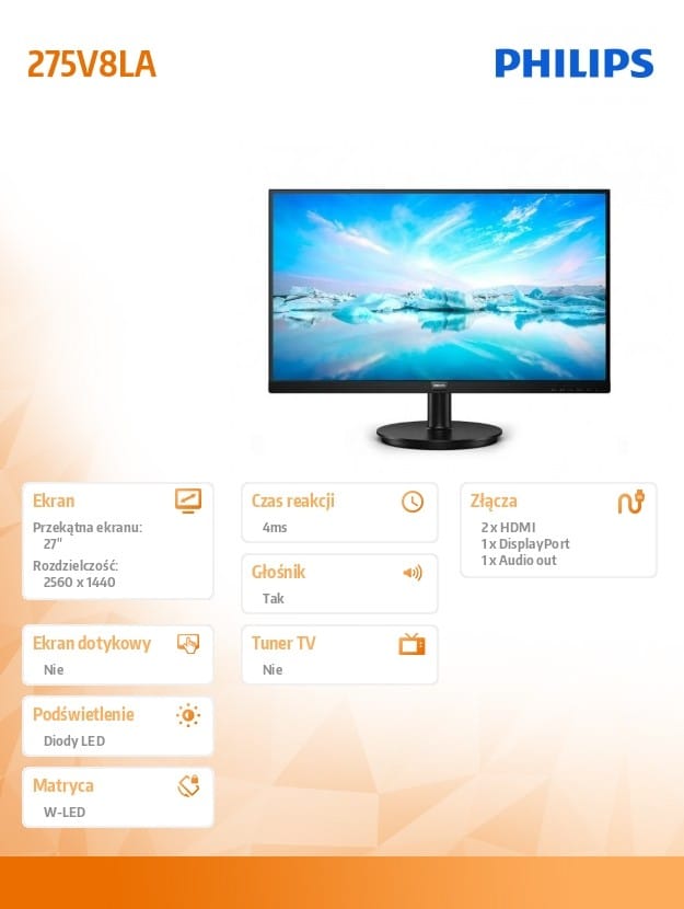 Wyświetlacz:Długość przekątnej ekranu (cale) - 27Typ HD - QHDTyp ekranu - LCDJasność - 250Typ ekranu - 2560 x 1440Czas odpowiedzi (typowy) - 4Ektran dotykowy - NoMaksymalna częstotliwość odświeżania - 75Format obrazu - 16:9Design:kolor - BlackŁączność:Ilość portów HDMI - 2Technical details:Producer product name - 275V8LA/00Producer product family - MonitorProducer - Philips:Warranty - 24