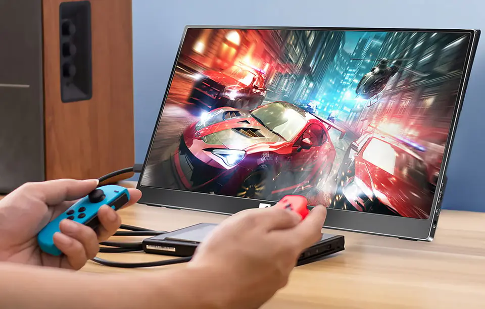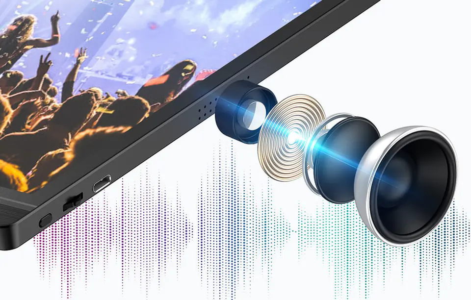Swobodnie słuchaj ulubionych piosenek, bez konieczności podłączenia dodatkowych głośników! Przenośny monitor wyposażono w 2 głośniki, które pozwalają cieszyć się wysoką jakością dźwięku, a ponadto oferują niesamowity efekt dźwięku przestrzennego Dolby Atmos. Niezależnie od tego, czy oglądasz film, słuchasz muzyki czy grasz w gry, wbudowane głośniki przeniosą Cię w sam środek wydarzeń!