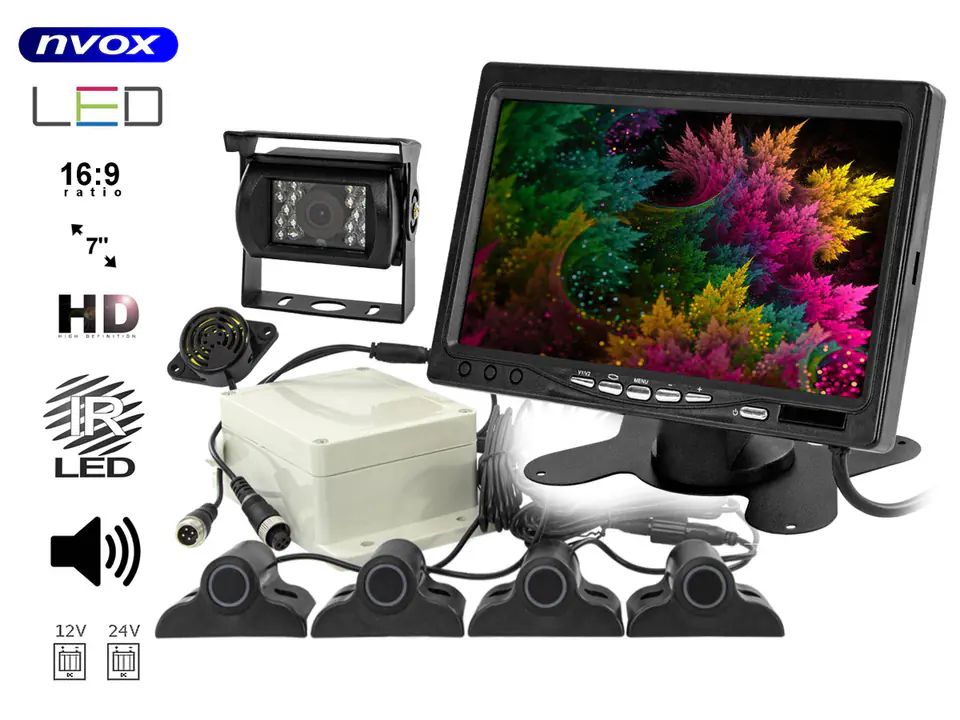Monitor samochodowy LCD 7" z obsługą do 2 kamer i czujnikami parkowania