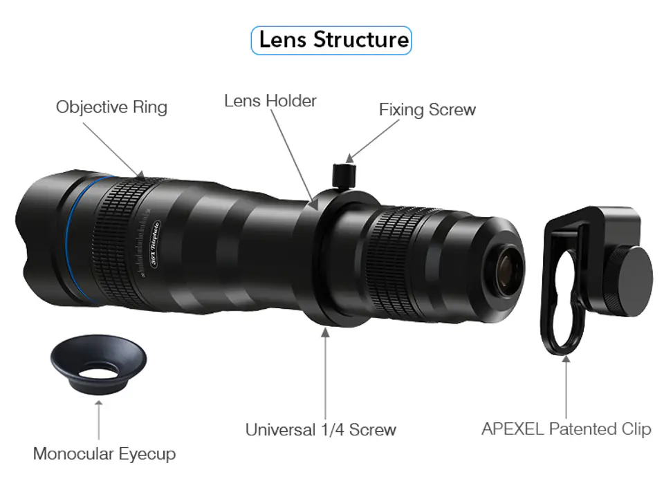- Ogromna kompatybilność- Do teleobiektywu dołączony jest uniwersalny klips, który pasuje do prawie wszystkich smartfonów, takich jak iPhone, SAMSUNG, Galaxy, Pixel, HUAWEI, Redmi, Oneplus, itp.