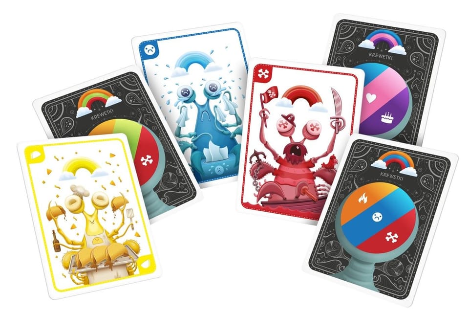 W Morderczych Krewetkach ważne są awersy i rewersy kart. Na rewersie każdej z nich są pokazane 3 kolory. Z kolei na awersie jest postać, której kolor odpowiada 1 z 3 kolorów pokazanych z tyłu. W ten sposób widząc zakrytą kartę nie wiemy, jaki kolor ma postać po drugiej stronie, ale pole możliwości jest znacznie zawężone.