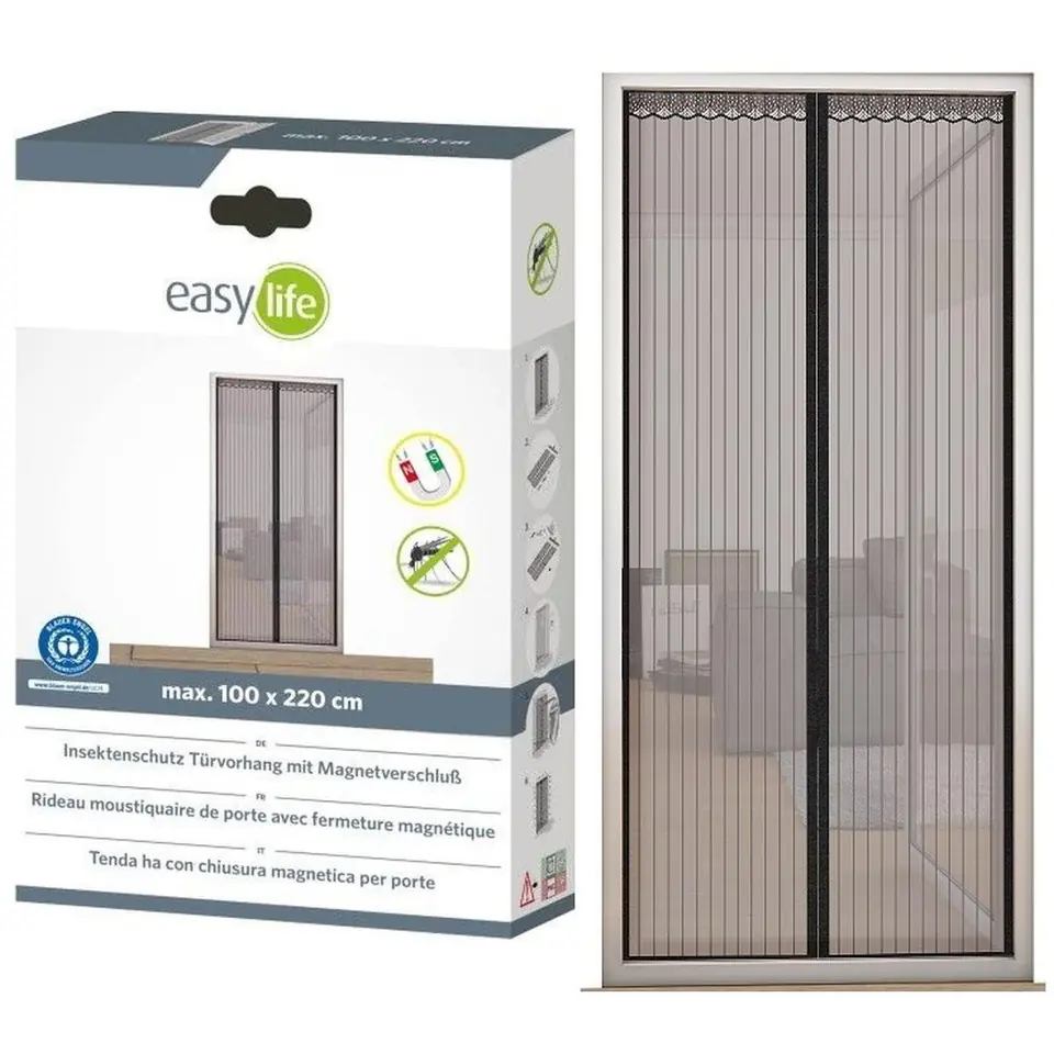 MOSKITIERA DRZWIOWA LAMELOWA 100 x 210 CM Z ZAMKNIĘCIEM NA MAGNES to skuteczne rozwiązanie, które chroni przed niechcianymi owadami, wpuszczając jednocześnie świeże powietrze. Jej lamelowa budowa i magnesy przyczepione do brzegów ułatwiają wychodzenie oraz wchodzenie do wnętrza. Wychodząc przez zasłonę, rozsuwasz pasy, które po twoim przejściu „automatycznie" domkną się dzięki 18 magnesom, zabezpieczając pomieszczenie przed wpadającymi owadami. Moskitiera od EASY LIFE zbudowana jest z siatki o małych, gęstych oczkach i charakteryzuje się nowoczesnym, eleganckim wzornictwem. Zamontujesz ją szybko bez wiercenia i wkręcania, na rzepach zaopatrzonych w taśmę samoprzylepną, które zabezpieczysz pinezkami dołączonymi do zestawu. Elegancka koronkowa taśma maskująca zasłoni miejsce montażu. Produkt wykonany jest z wytrzymałej siatki poliestrowej odpornej na wiatr czy deszcz.