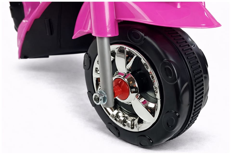 Różowa wersja akumulatorowego ścigacza przyciąga wzrok zarówno niecodzienną kolorystyką, jak i konstrukcją oraz zdobieniami w formie różnokolorowych, kontrastujących naklejek charakterystycznymi dla pełnowymiarowych pojazdów. Na jasnoróżowym nadwoziu wykonanym z trwałego i solidnego plastiku ABS umieszczono oznaczenia modelu, sprawiające, że pojazd wygląda bardzo nowocześnie i oryginalnie. Doznanie to podnosi imitacja chromowanych elementów przypominających układ wydechowy, co z pewnością zrobi wrażenie na każdym dziecku. Wysoce istotnym rozwiązaniem jest także trzykołowa konstrukcja, ułatwiająca prowadzenie pojazdu dziewczynkom mającym problem z utrzymaniem równowagi podczas jazdy. Zabawa jeszcze nigdy nie była tak prosta!Różowy ścigacz HC8051 wyposażony jest w akumulator żelowy 6V4,5Ah oraz silnik typu STRONG o mocy 18 W. Duet tych podzespołów pozwala na osiągniecie prędkości oscylującej wokół 4 km/h, co przyniesie ogromną frajdę każdemu dziecku. Co więcej: model ten posiada dwa biegi — przód i tył, co w dużym stopniu ułatwia zabawę. Konstrukcja dziewczęcego motorka na akumulator jest bardzo przemyślana — ulokowano ją na kołach o wielkości 19 cm, na których umieszczono gumowe opaski. Rozwiązanie to pozwala na jazdę na utwardzonej powierzchni różnego rodzaju, nie wydając przy tym hałasu.