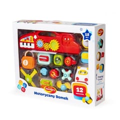Domek stworzony z myślą o miłośnikach klocków i zręcznościowych niespodzianek! W zestawie znajdziemy dużą płytkę z wypustkami – ściankę domku, do której można przypiąć klocki z motorycznymi zadaniami. Na małe paluszki czeka wiatraczek do obracania, zasuwki do przesuwania, klamerka do zapinania, element do przekręcania i wiele więcej! Dach domku wyposażony został nie tylko w praktyczny uchwyt do przenoszenia zabawki, ale także w dźwiękowy panel z mini pianinkiem i miejscem na przypięcie jednego z dwóch aktywnych klocków – z dzwoneczkiem lub lampką. Dodatkowo znajdziemy tu też trybiki do przekręcania. To jeszcze nie wszystko! Poza domkiem i klockami, w skład zestawu wchodzi też pojazd z miejscami do przypięcia ulubionych, zręcznościowych klocków, żeby mogły one towarzyszyć maluchowi podczas podróży, dbając o sprawność jego paluszków.