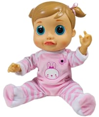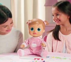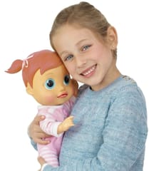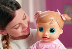 Lalka reaguje także na dotyk i interakcję — śmieje się, jeśli ją połaskoczesz, a kiedy przyłożysz do ucha dołączony zabaw-telefon, „porozmawia” z mamą, tatą, babcią lub dziadkiem.