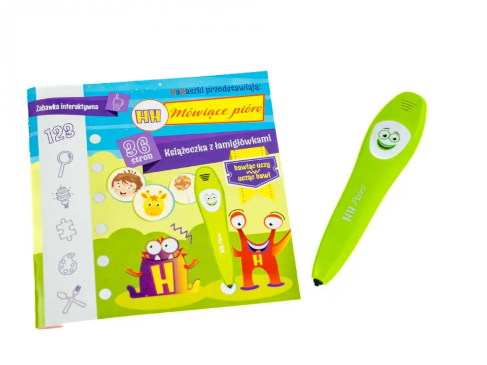 Mówiące pióro z książeczką, to edukacyjna zabawka interaktywna polegająca na pytaniach i odpowiedziach opracowana specjalnie dla dzieci w wieku przedszkolnym.