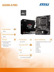 Płyta główna MSI A520M-A PRO obsługuje procesory AMD Ryzen™ trzeciej generacji oraz desktopowych układów z serii AMD Ryzen™ 4000 G. Wbudowany interfejs HDMI obsługuje rozdzielczości do 4K UHD. Seria PRO pomaga użytkownikom pracować w znacznie bardziej sprytny sposób, co bezpośrednio przekłada się na wyższą wydajność i produktywność. Dzięki szerokim możliwościom funkcjonalnym i wysokiej jakości montażu, płyty główne z serii PRO charakteryzują się tylko optymalizacją pod kątem profesjonalnych zadań, ale także minimalizują liczbę mogących się pojawić podczas długoletniej eksploatacji problemów i oferując tym samym znacznie dłuższą żywotność.