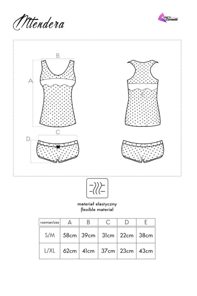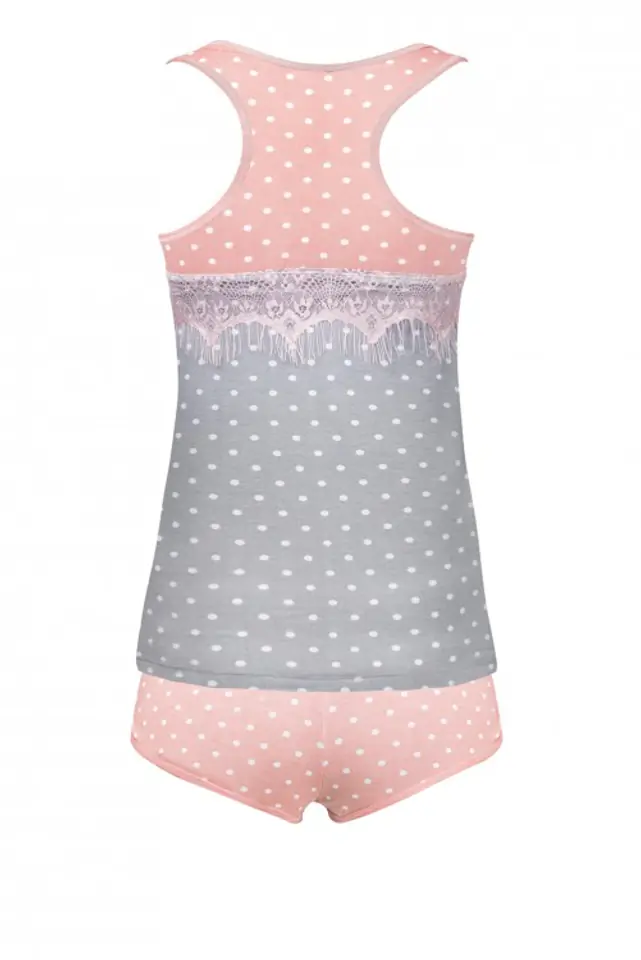 Urocza piżama w pięknych odcieniach szarości i różu ,wykonana z miłego w dotyku materiału. Bluzka na szerokich ramiączkach ozdobiona na biuście koronką. Spodenki krótkie z elastyczną gumką w pasie i satynową kokardką.