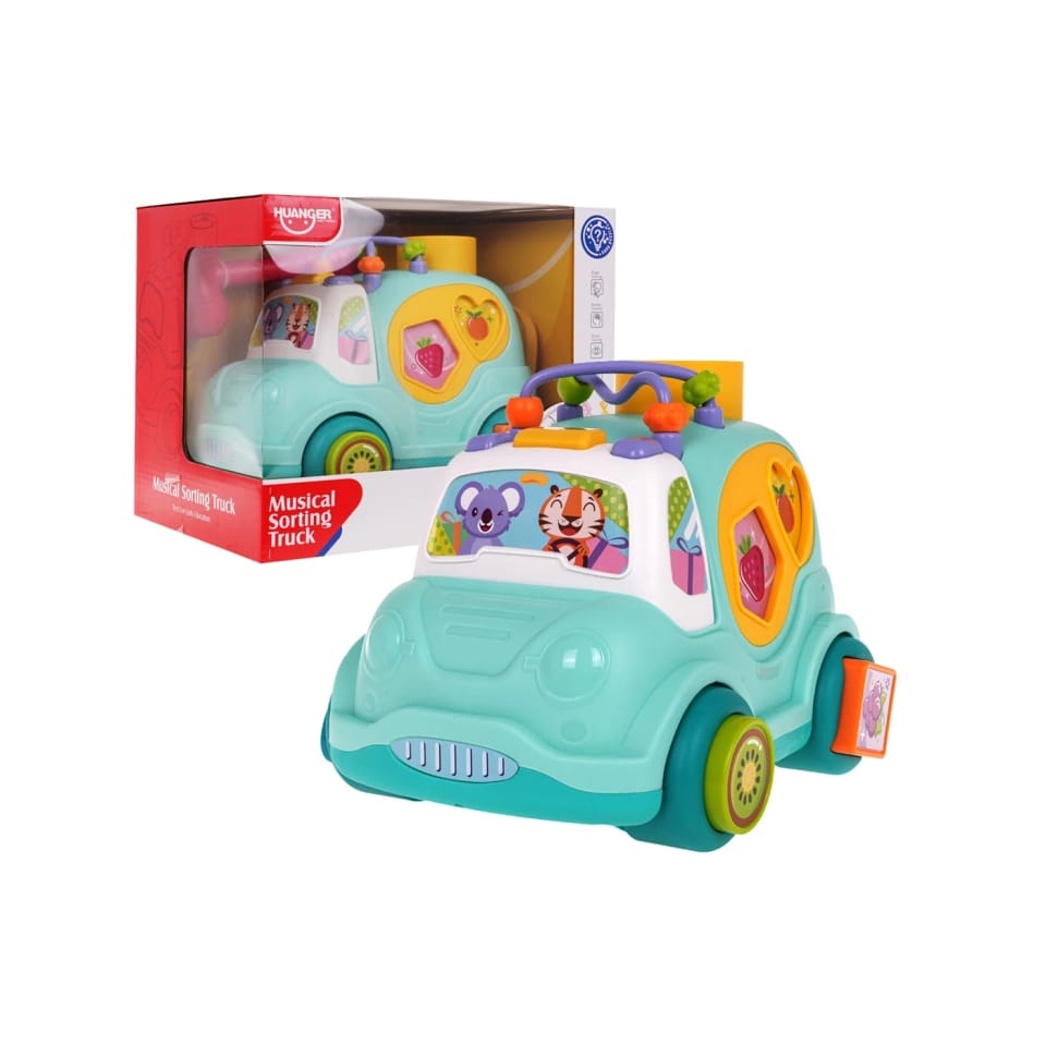 | Interaktywny autobusik z sorterem, efektami dźwiękowymi i światłem dla dzieci powyżej 18-go miesiąca życia. Autobusik posiada sorter kształtów po bokach oraz na kołach. W zestawie znajdują się 4 klocuszki do dopasowania. Na dachu umiejscowiono wlot do wbijania piłek młotkiem do środka pojazdu (młotek i piłki w zestawie). Piłki posiadają grzechotki w środku. Przy wlocie znajduje się również przekładanka z koralikami. Piłeczki ze środka pojazdu możemy wyjąć, otwierając tylną klapę pojazdu. Na górze przedniej szyby znajduje się przycisk uruchamiający efekty dźwiękowe takie jak odgłosy odpalania pojazdu, klaksonu czy też wesołe melodie. Efektom dźwiękowym towarzyszą mrugające światełka. Zabawka zasilana jest bateriami typu 2 x AA 1,5 V (brak w zestawie). Funkcje zestawu:- odpowiedni dla dzieci powyżej 18-go miesiąca życia,- wykonany z najlepszej jakości materiałów w żywych kolorach,- funkcje dźwiękowe: melodie, odgłosy odpalania pojazdu, klaksony,- efekty świetlne w postaci mrugających światełek,- sorter kształtów po bokach pojazdu i na kołach,- przekładanka z koralikami,- wlot do wbijania piłek,- piłki z grzechotkami, młotek i klocuszki w zestawie,- otwierane drzwi pojazdu. | |
