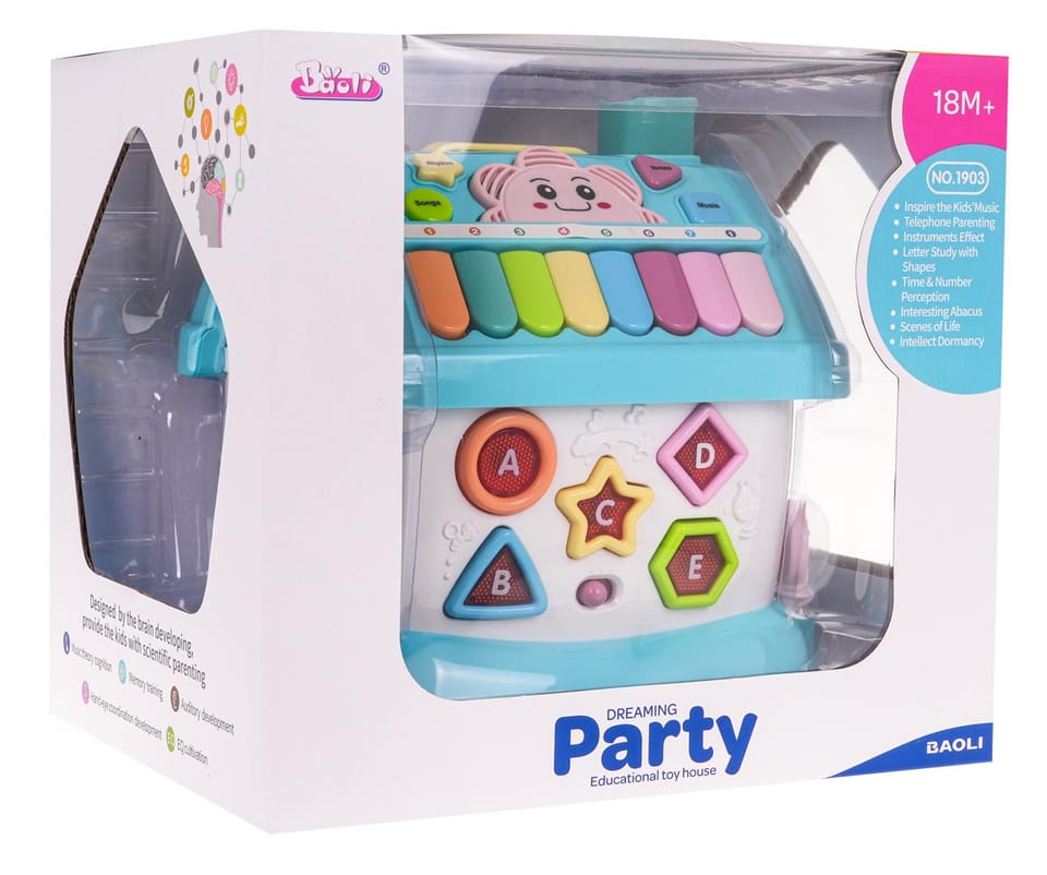 | Interaktywny, edukacyjny domek dla dzieci od 18-go miesiąca życia. Domek wykonany został z najlepszej jakości plastiku, w żywych kolorach, przyciągających wzrok dziecka i zachęcających do edukacyjnej zabawy. Domek posiada 4 ściany oferujące różne atrakcje, różowy daszek oraz rączkę do przenoszenia. Zabawka zasilana jest bateriami typu 3 x AA 1,5 V (brak w zestawie). Do zestawu dołączone jest również niebieskie autko. Ścianka z drzwiami garażowymi i zegarem. Na tej ścianie znajduje się zegar z ruchomymi wskazówkami i otwieranymi drzwiami do garażu. Po otwarciu garażu wyjeżdża ze środka różowy samochodzik (dołączony do zestawu). Ścianka z alfabetemNa tej ściance znajduje się włącznik i wyłącznik z regulacją głośności. W różnokolorowych figurach geometrycznych umieszczono litery: A, B, C, D, E. Po naciśnięciu raz na literkę usłyszymy jej nazwę w języku angielskim. Po ponownym naciśnięciu usłyszymy nazwę figury geometrycznej. Podczas naciskania, figura się podświetla. Ścianka z drzwiami wejściowymi Drzwi otwierają się za pomocą klucza znajdującego się obok nich. Kluczyk dodatkowo posiada sznureczek i jest przymocowany do ściany, żeby nie zaginął. Na tej ściance znajduje się również lampa z podświetleniem oraz odgłosami dzwonka i zamykanych drzwi. Ścianka z obrotowymi elementamiNa tej ściance mamy 5 obrotowych elementów z rysunkami i numerkami oraz 9 obrotowych kółeczek. Dach domkuNa dachu domku znajduje się z jednej strony wyjmowany telefonik, a obok niego klawiatura numeryczna z odgłosami dzwonków i nazwami liczb. Z drugiej organki z ośmioma kolorowymi klawiszami, słoneczkiem i przyciskami muzycznymi. Na pianinku malec może grać nuty. Za pomocą przycisku z tonami możemy zmieniać brzmienie pianinka. Mamy również przycisk z różnymi rytmami, z piosenkami i muzyką. Na dachu domku znajduje się również wysuwana rączka do przenoszenia zabawki, kółko z podświetleniem oraz wciskany komin. Po naciśnięciu komina z okienko otwiera się i słyszymy dźwięk ptaszka. Funkcje zestawu:- przeznaczony dla dzieci powyżej 18-go miesiąca życia,- wykonany z najlepszej jakości plastiku w żywych kolorach,- funkcje dźwiękowe: odgłos grzechotania przy przesuwaniu wskazówek zegara, nazwy literek, odgłosy dzwonków, odgłosy wybierania tonowego, śpiew ptaszka, odgłos dzwonków i zamykania drzwi, nazwy figur geometrycznych i liczb, nuty, tony, rytmy, piosenki, muzyka.- funkcje świetlne: lampka przed drzwiami wejściowymi, kółko na dachu, figury geometryczne,- uczy nazw figur geometrycznych, liczb, liter, ćwiczy małe rączki,- każda ze ścianek oferuje inne atrakcje,- organki i telefonik na dachu domku- ruchome elementy: otwierane drzwi wejściowe i brama garażowa, wyjmowany telefon, przekładanka, obrotowe kółeczka.- wygodna rączka do przenoszenia,- samochodzik w zestawie. | |