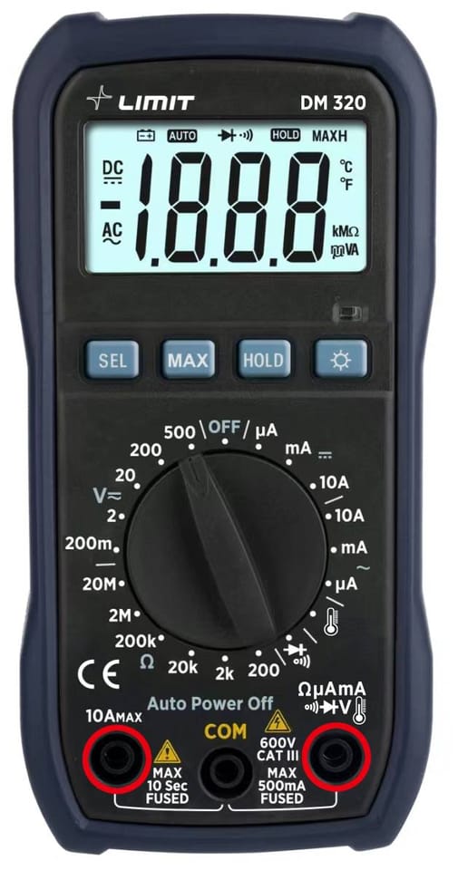 Multimetr Limit DM 320 to ręczny multimetr cyfrowy cechuje się wysoką niezawodnością (2000 zliczeń) i bezpieczeństwem (ochrona przeciwprzepięciowa CAT III). Dzięki dużemu ekranowi i wyświetlaczowi o wysokiej rozdzielczości multimetr ułatwia prace nawet w warunkach ograniczonej widoczności. Wysoka klasa zabezpieczenia przed przeciążeniem i unikalna konstrukcja czyni go praktycznym i funkcjonalnym urządzeniem. Multimetr może mierzyć napięcie/prąd stały jak i przemienny AC/DC, rezystancję, ciągłość obwodu, temperaturę, może być używany również do testowania diód. Podświetlany wyświetlacz ułatwia odczyt w ciemnym otoczeniu. Wyposażony w funkcje podtrzymania danych oraz pomiar wartości maksymalnej. LIMIT DM 320 wyposażony jest ponadto we wskaźnik niskiego poziomu naładowania baterii oraz automatyczne wyłączanie zasilania. Dzięki temu LIMIT DM 320 jest miernikiem idealnym do wielu zastosowań: w przemyśle, motoryzacji czy hobbystycznie w domu.