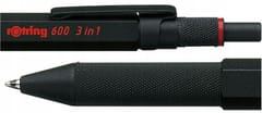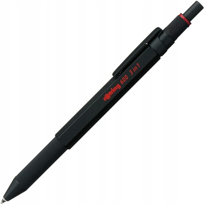 - rOtring 600 3w1 długopis i ołówek automatyczny, przełącza się między 2 końcówkami długopisów fine (czarny i czerwony tusz) a 1 końcówką ołówka automatycznego (0,5 mm), czarny korpus