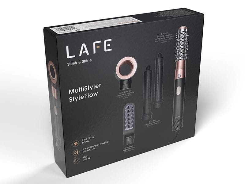 MultiStyler 5 w 1 LAFE StyleFlow – stylizacja włosów w jednym urządzeniu5 wymiennych nasadek – wiele możliwości stylizacji3 poziomy pracy – dopasowanie do włosówMoc 700 W – skuteczne suszenie i stylizacjaObrotowy przewód 360° – wygoda użytkowaniaOchrona przed przegrzaniemLAFE StyleFlow – codzienna stylizacja bez wysiłku