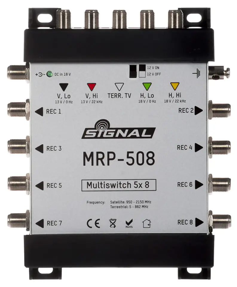Multiswitche są przeznaczone do pracy wewnątrz budynku. To urządzenie dystrybuuje sygnał z jednego satelity oraz telewizji naziemnej i radia FM do maksymalnie ośmiu gniazd. Możemy, zatem podłączyć je do ośmiu jednogłowicowych tunerów satelitarnych. A jeżeli nasz tuner posiada dysk twardy (PVR), to musimy mu zarezerwować dwa wyjścia multiswitcha. A niewykorzystane wyjście multiswitcha należy obciążyć rezystorem 75 Om. Przełącznik w tym multiswitchu wyposażono w bierny tor telewizji naziemnej, i dlatego musimy zastosować przedwzmacniacz antenowy lub wzmacniacz, który skompensuje tłumienie multiswitcha (14 dB) i elementów biernych w instalacji (przewodu, gniazd, złączy) w torze telewizji naziemnej. Wybierając wzmacniacz musimy uwzględnić poziom sygnału z nadajnika (moc i wysokość zawieszenia nadajnika, odległość do punktu odbioru, zysk anteny, ukształtowanie terenu między nadajnikiem a odbiornikiem).