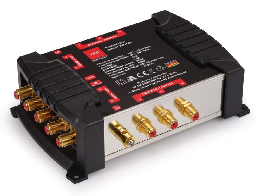 Rozdzielenie sygnału satelitarnego i naziemnego wychodzącego z multiswitcha odbywa się za pomocą gniazd abonenckich końcowych. Konwertery Quattro, Quad i gniazda abonenckie są dostępne w naszym sklepie. Zasilanie multiswitcha odbywa się za pośrednictwem zewnętrznego zasilacza dzięki czemu wyeliminowane jest zjawisko zwiększonej temperatury pracy będące częstym powodem uszkodzeń urządzenia.