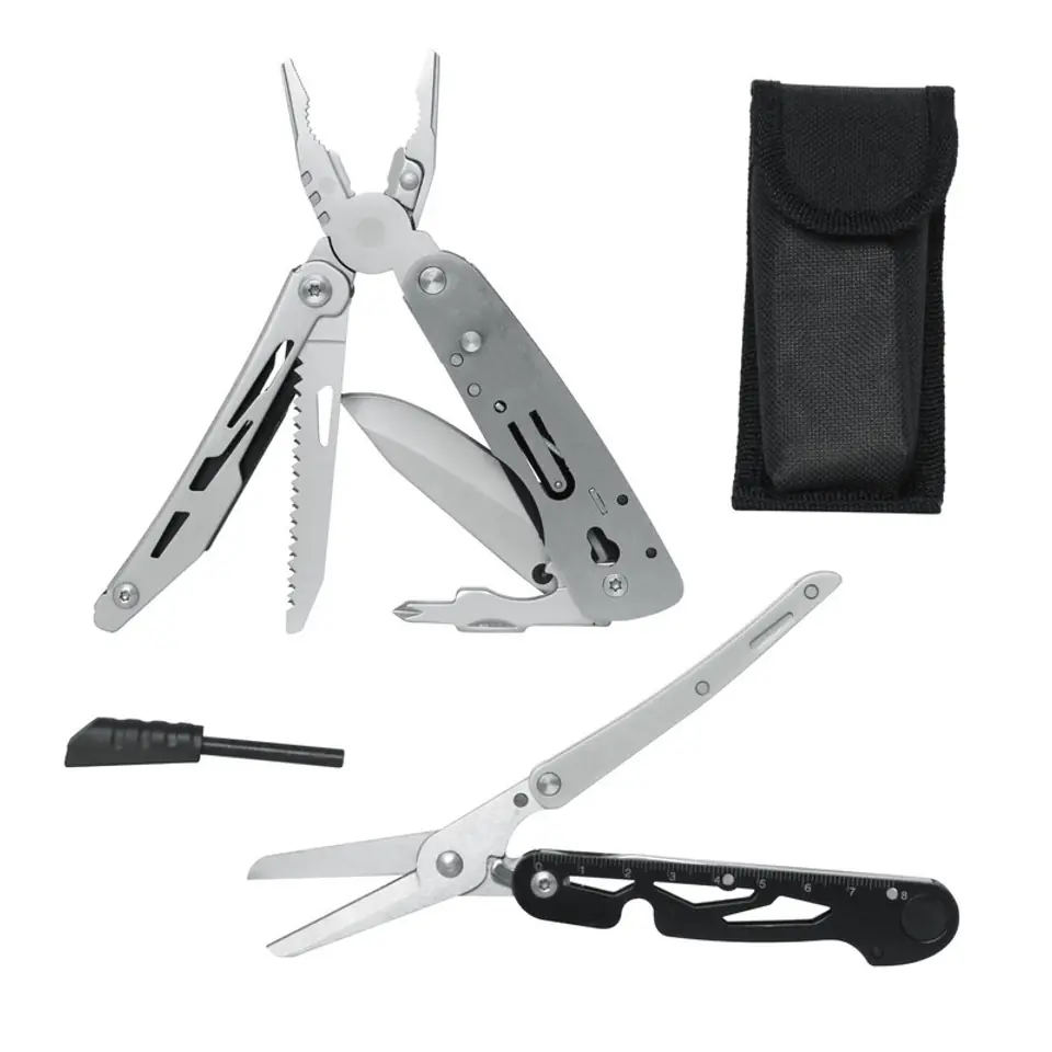 multitoola ze szczypcami, piłą do metalu, śrubokrętem i nożem oraz wyjmowanych nożyczek uniwersalnych.
