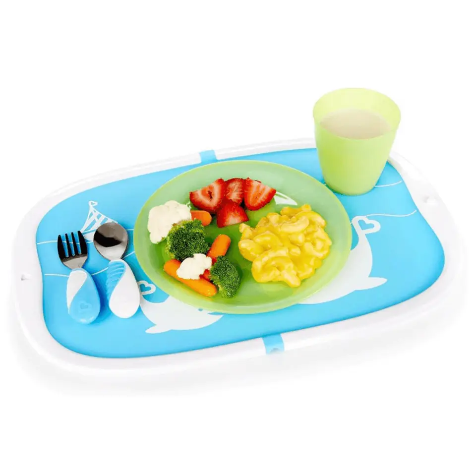 Składana podkładka do jedzenia Munchkin Go - niebieska Nietoksyczna składana silikonowa podkładka Plastikowa rama pomaga utrzymać bałagan na macie Składa się i zatrzaskuje, aby przenosić okruchy do zlewu, bezproblemowy posiłek Spójrzmy prawdzie w oczy - dzieci i rozsypywanie jedzenia idą ręka w rękę, ale z pewnością nie muszą wymykać się spod kontroli. Przenośna podkładka silikonowa Munchkina ma super mocną przyczepność, dzięki czemu jest bezpiecznie przymocowana do stołu, podczas gdy maluchspokojnie je posiłki. Maluchy uwielbiają zabawne kształty zwierząt, a rodzice uwielbiają plastikową krawędź, która utrzymuje okruchy i klopsiki na macie zamiast na podłodze. Gdy zabawa się skończy, a brzuchy będą pełne, możesz ją łatwo złożyć, zatrzasnąć i wrzucić do kuchni, aby szybko i łatwo wyczyścić ją w zmywarce lub zlewie. Doskonale nadaje się do posiłków w domu, ale także świetnie sprawdza się w podróży, ponieważ utrzymuje jedzenie i ręce z dala od brudnych stołów. Pora posiłku stała się o wiele łatwiejsza do przełknięcia.