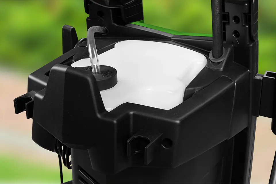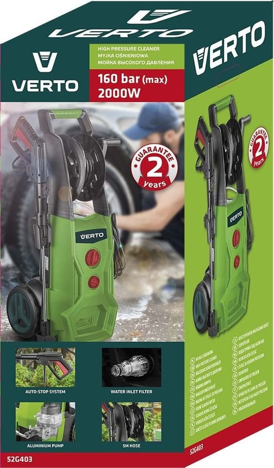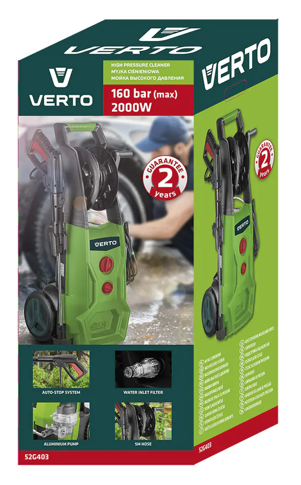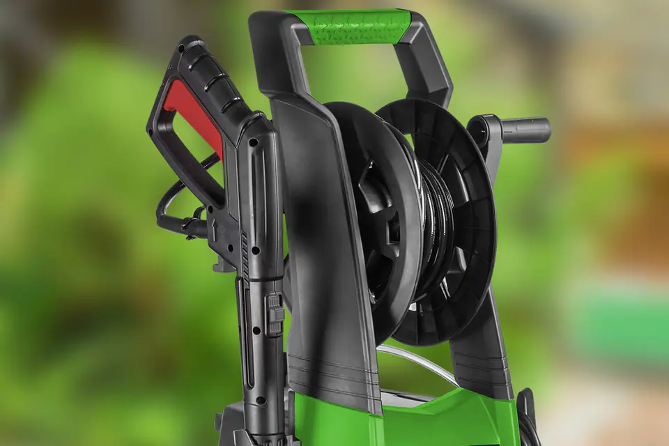 Myjka ciśnieniowa 2000 W, aluminiowa pompa, ciśnienie robocze 110 bar, maks. ciśn. 160 bar, przepływ 6.5 l/min, max. temperatura wody zasilającej 50C, masa 11.2 kg, akcesoria: rękojeść pistoletowa, lanca z dyszą, wbudowany zbiornik na detergent, wąż wysokociśnieniowy 5 m na bębnie, uchwyt na wyposażenie, złacze wlotu wody z filtrem, przetyczka do czyszczenia dyszy