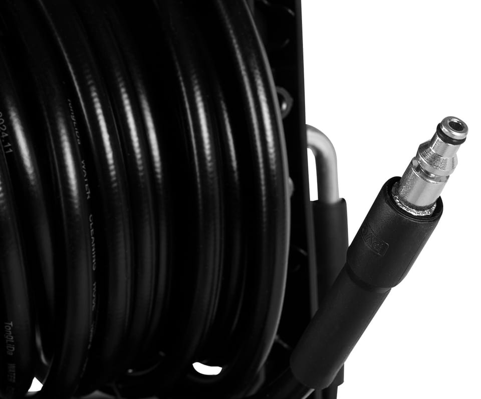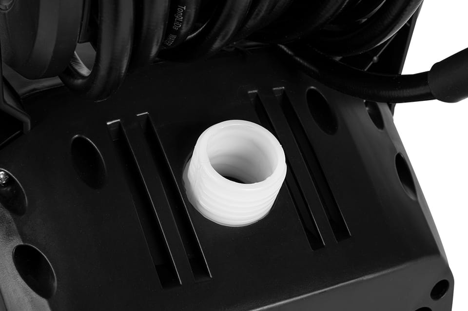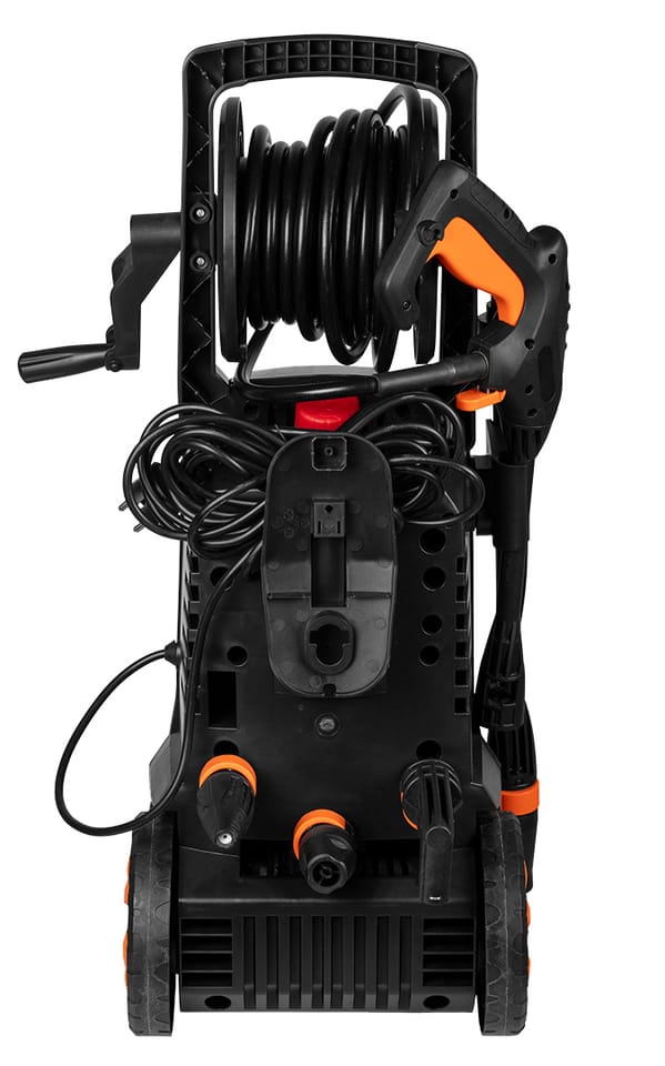 Myjka ciśnieniowa 2200W, aluminiowa pompa, maks. ciśnienie 165 Bar, wbudowany pojemnik na detergent, wydajność 438L/h (7,3L/min), max. temperatura wody zasilającej 60°, akcesoria: rękojeść pistoletowa, lanca z dyszą, końcówka TURBO, końcówka kątowa 90°, końcówka do mycia pianą, szczotka, szczotka do czyszczenia patio, wąż wysokociśnieniowy 8m na bębnie, uchwyty na wyposażenie, złącze wlotu wody z filtrem, igła do czyszczenia dyszy, waga 10,8