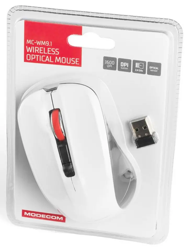 Mysz MC-WM9.1Tworząc uniwersalną i praktyczną mysz MC-WM9.1, za nadrzędny cel stawialiśmy sobie jej żywotność oraz ergonomię użytkowania. Wiemy także, że mysz musi podobać się użytkownikowi. Jej klasyczny wygląd dostępny w trzech wersjach kolorystycznych (czarna, czarno-niebieska, czarno-biała) trafia w gusta wymagających użytkowników doceniających klasykę w nowoczesnym wydaniu. Powierzchnia myszy wykonana jest z przyjemnego w dotyku materiału. MODECOM MC-WM9.1 łączy w sobie najlepsze cechy klasycznej, solidnej i ergonomicznej konstrukcji.Kluczowe cechy:- Klasyczny i elegancki design- Wysoka ergonomia użytkowania- Dostępna w trzech kolorach (czarny, czarno-niebieski, czarno-biały)- Sensor optyczny 800/1200/1600 DPI (regulowane przyciskiem)- Liczba przycisków: 4- Bezprzewodowa technologia radiowa 2.4 GHz- Interfejs: USB (nano-odbiornik)MateriałPowierzchnia myszy wykonana jest z przyjemnego w dotyku materiału, który zapewnia komfort użytkowania.Oszczędzanie energiiMysz posiada funkcję automatycznego oszczędzania energii, co pozwala dłużej cieszyć się jej pracą.Paleta barwMysz nie tylko musi działać w niezawodny sposób i nie męczyć dłoni. Musi także cieszyć oko i dlatego oferujemy ją w aż trzech wersjach kolorystycznych.SensorMODECOM MC-WM9.1 została wyposażona w sensor o rozdzielczości 800/1200/1600 DPI. 1600 DPI to optymalna wartość, aby cieszyć się wygodną pracą z ekranami o wysokiej rozdzielczości.Ergonomia przede wszystkimMysz musi być wygodna i nie męczyć dłoni. Taka jest właśnie MC-WM9.1. To urządzenie które po wielu godzinach użytkowania nie powoduje zmęczenia dłoni ani palców.