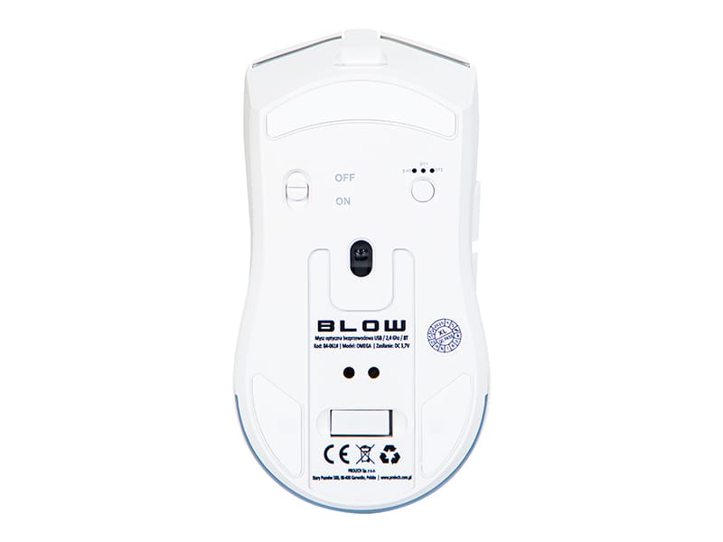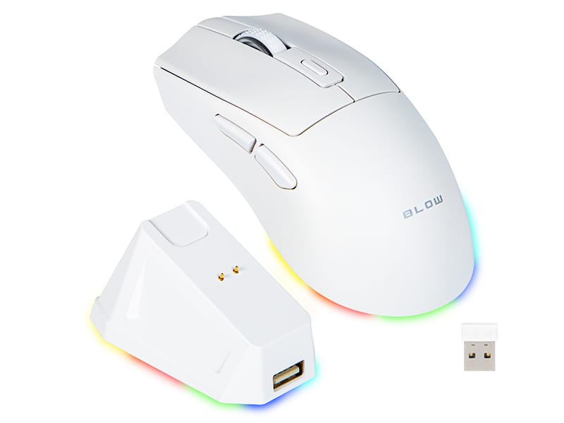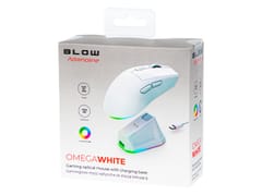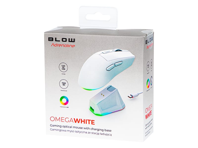 Bezprzewodowa mysz gamingowa BLOW Adrenaline OMEGA to połączenie nowoczesnego designu i wysokiej funkcjonalności. Wyposażona w precyzyjny sensor o rozdzielczości 7200 DPI, 6 programowalnych przycisków oraz podświetlenie LED RGB, zapewnia pełną kontrolę i wyjątkowy efekt wizualny. Dzięki obsłudze łączności 2,4G, Bluetooth oraz kablowej USB możesz dopasować sposób użytkowania do swoich potrzeb. W zestawie znajduje się stacja ładująca z funkcją huba USB, co czyni ją idealnym wyborem dla wymagających graczy.