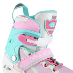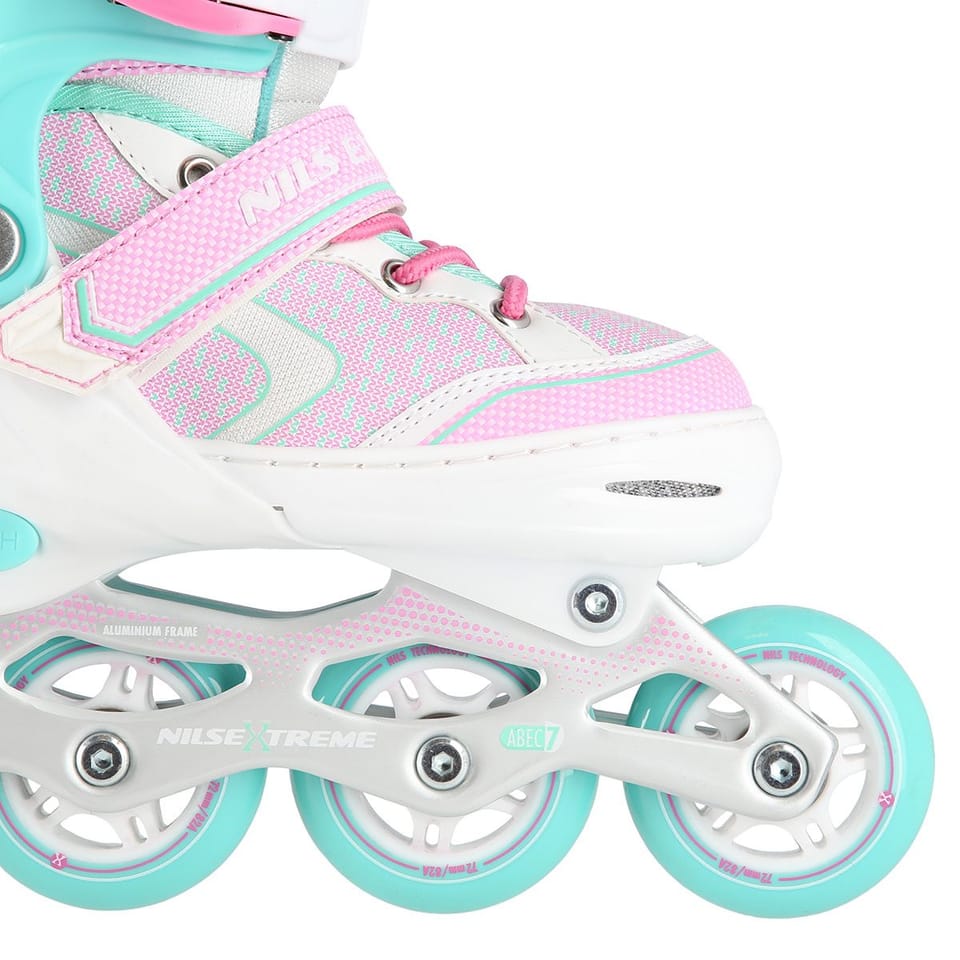 NA14198 Nils Extreme, to model łyżworolek przeznaczony dla początkujących oraz średniozaawansowanych pasjonatów jazdy. Jest połączeniem ciekawego wzornictwa z najwyższej jakości materiałami, które gwarantują bardzo duży komfort użytkowania. But wykonany został z syntetycznej skóry, materiału EVA, siatki MESH oraz pianki o dużej gęstości. Dzięki temu jazda będzie niezwykle komfortowa. Dodatkowo, but jest wentylowany. Łożyska klasy ABEC7, zapewniają wysoką jakość trakcji. Miękkie kółka, gwarantują dobrą przyczepność do podłoża oraz dobrze absorbują wszystkie drgania. Zapięcie buta za pomocą klamry dwusekcyjnej, rzepa i sznurowadeł, zapewnia maksymalne bezpieczeństwo podczas jazdy, natomiast hamulec wykonany z najwyżej jakości PP, odpornego na uderzenia, spowoduje bezpieczne zatrzymanie, nawet przy stosunkowo dużych prędkościach. Możliwość regulacji rozmiaru, ułatwia szybkie dopasowanie do stopy użytkownika, dzięki czemu łyżworolki posłużą na wiele sezonów! Specyfikacja: Płoza łyżworolki: aluminium Łożyska: ABEC7 But: półmiękki z systemem wentylacji Materiał: Mesh EVA Velvet Syntetyczna skóra Pianka o dużej gęstości Kółka: PU64 mm/82A (S 31-34) PU72 mm/82A (M 35-38) PU76 mm/82A (L 39-42) Zapięcie: Klamra dwusekcyjna Pasek na rzep Sznurowanie Długość wewnętrzna buta: 242 - 263 mm Hamulec: PP odporne na uderzenia Uwagi: Nie przeznaczone do użytku komercyjnego Zgodne z normą PN-EN 13843:2009 Gwarancja 24 miesiące Importer: Abisal Sp. z o.o.| Polska | 41-807 Zabrze | ul. Pyskowicka 17 | e-mail: abisal@abisal.plAbisal Sp. z o.o. deklaruje, iż produkty sprzedawane przez firmę są bezpieczne i spełniają wymagania zawarte w Ustawie o ogólnym bezpieczeństwie produktów z dnia 12 grudnia 2003r. (Dz.U. z dnia 31 grudnia 2003r.)