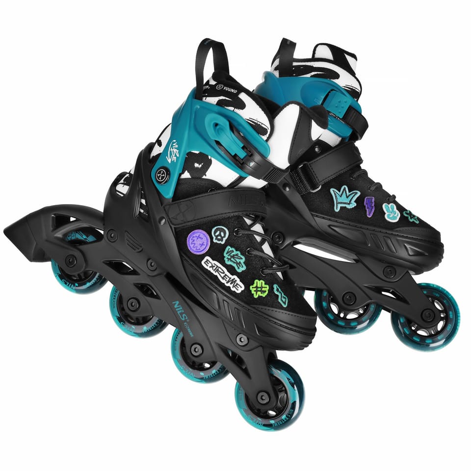 ass="dmat" style="font-size:14px; line-height:1.5; margin-bottom:0px; margin-left:0px; margin-right:0px; margin-top:0px; padding-bottom:0px; padding-left:0px; padding-right:0px; padding-top:0px">NA2053A VIBE NILS EXTREME w wersji turkusowej to łyżworolki o dynamicznym, sportowym charakterze, stworzone dla użytkowników ceniących aktywną jazdę i nowoczesny design. Wyrazista kolorystyka podkreśla energię i styl modelu. Model wyposażono w system personalizacji oparty na wymiennych naszywkach dekoracyjnych mocowanych na rzep. System personalizacji oparty na wymiennych naszywkach dekoracyjnych to rozwiązanie inspirowane trendem personalizacji, które pozwala wyróżnić się spośród klasycznych modeli i nadać rolkom indywidualny charakter. Dołączony zestaw naszywek umożliwia szybką zmianę wyglądu rolek bez użycia narzędzi. Konstrukcja oparta na rzepach pozwala również na stosowanie innych kompatybilnych naszywek, co daje swobodę dalszej personalizacji sprzętu. Model VIBE zaprojektowano z myślą o początkujących oraz rekreacyjnych użytkownikach. Stabilna konstrukcja buta zapewnia dobre trzymanie stopy, a łożyska ABEC-5 wspierają płynną jazdę. Kółka PU oferują dobrą przyczepność i skuteczne tłumienie drgań. Zapięcie z klamrą, sznurowadłami oraz paskiem na rzep umożliwia precyzyjne dopasowanie rolek do stopy i zwiększa bezpieczeństwo użytkowania. ass="dmat" style="font-size:14px; line-height:1.5; margin-bottom:0px; margin-left:0px; margin-right:0px; margin-top:0px; padding-bottom:0px; padding-left:0px; padding-right:0px; padding-top:0px">Specyfikacja: