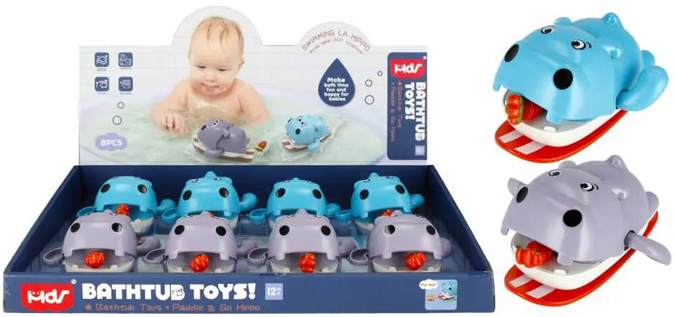 Hipopotam posiada ruchomą paszczę z małą marchewką na sznurku. Kiedy pociągniemy za sznurek hipcio rozpocznie pływanie.