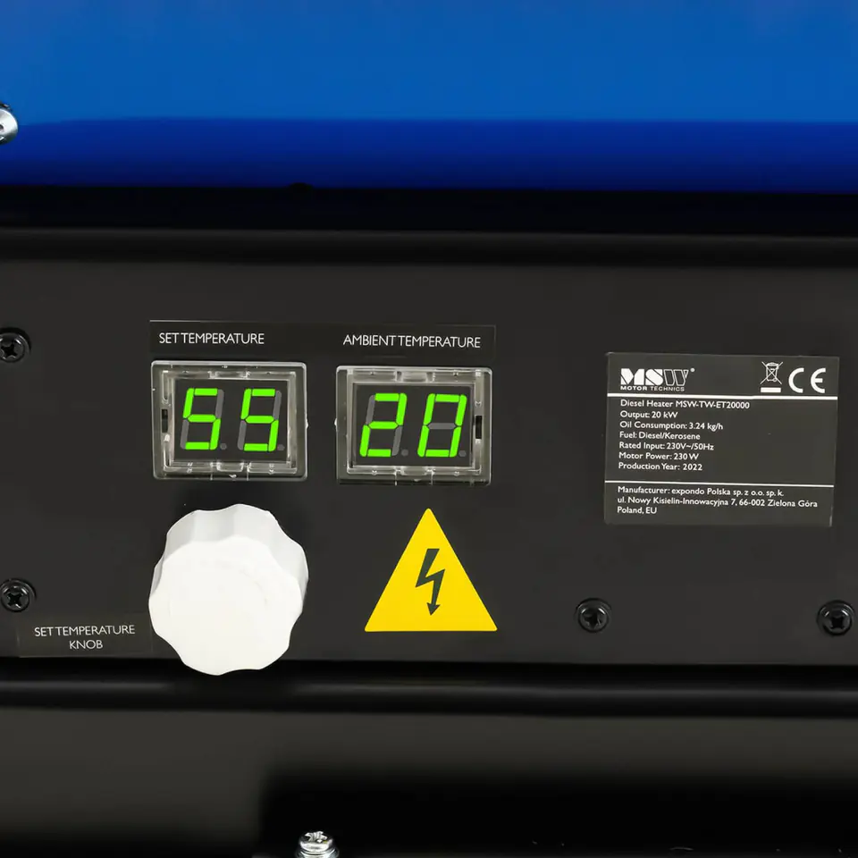 Kod producenta: 10062157Nagrzewnica olejowa marki MSW pozwala szybko i skutecznie ogrzać pomieszczenie magazynowe, czy namiot do komfortowej temperatury. Do zasilania wykorzystuje się olej napędowy, który pomieści zbiornik 20 l. Wystarczy ustawić nagrzewnicę gazową na wózku, aby zapewnić optymalną temperaturę pracy na placu budowy, w magazynie lub warsztacie. Moc 20000 W i temperatura wyjściowej 450deg;C pozwala szybko doprowadzić temperaturę w pomieszczeniu do odpowiedniego poziomu. Temperaturę ustawia się za pomocą panelu z wyświetlaczem LED. Termostat sprawdza temperaturę zewnętrzną i nagrzewa urządzenie, jeśli spadnie poniżej ustawionej wartości. Przy pełnej mocy dmuchawa grzewcza generuje przepływ gorącego powietrza na poziomie 1071 m³/h. Wentylator rozprowadza je równomiernie po całym pomieszczeniu. Nagrzewnica ogrzeje pomieszczenie do 123 m². Urządzenie wyposażone jest w podwozie z kółkami i uchwytem, dzięki czemu jest mobilne i można łatwo je przestawić. Przy zużyciu 1.43 l/h nagrzewnica jest niezwykle wydajna. Dmuchawa wykonana jest z wytrzymałej blachy stalowej i ma szereg zabezpieczeń. Czujka rozpoznaje niekontrolowane płomienie i automatycznie wyłącza urządzenie. Dodatkowo posiada zabezpieczenie przed przegrzaniem, które gwarantuje bezpieczną ciągłą pracę. Należy pamiętać, aby przy używaniu nagrzewnicy, pomieszczenia były zawsze dobrze wentylowane Cechy produktu: