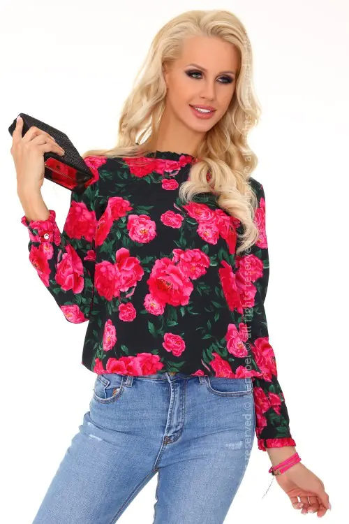 Zjawiskowa bluzka z falbanką przy dekolcie i mankietach. Mankiety zapinane na guziczki.