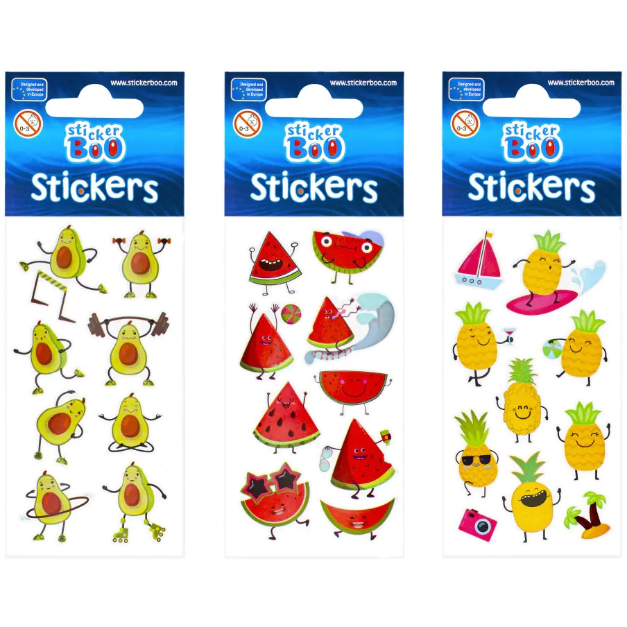 Naklejki STICKER BOO z grafiką z Owocami Ananas, Awokado lub Arbuz z pewnością przypadną do gustu dzieciakom, idealne do zdobienia rysunków, wszelkiego rodzaju prac plastycznych oraz kolekcjonowania.